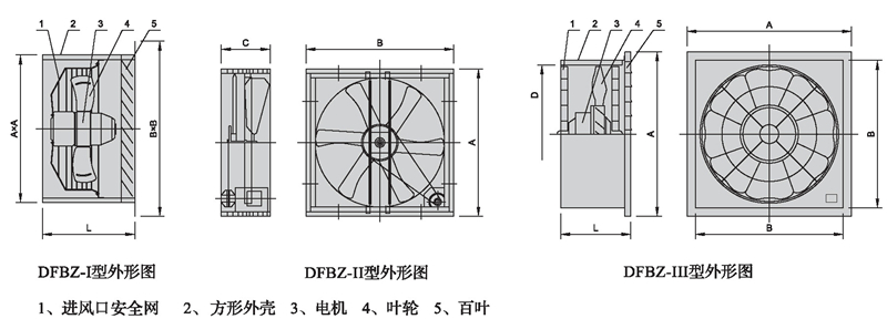 DFBZ-I型為采用內轉子電機直聯(lián)傳動結構形式、DFBZ-Ⅱ型采用內轉子電機、皮帶傳動結構形式,DFB-Ⅲ型為采用外轉子電機直聯(lián)傳動結構形式。可根據用戶要求制威防腐防爆型。